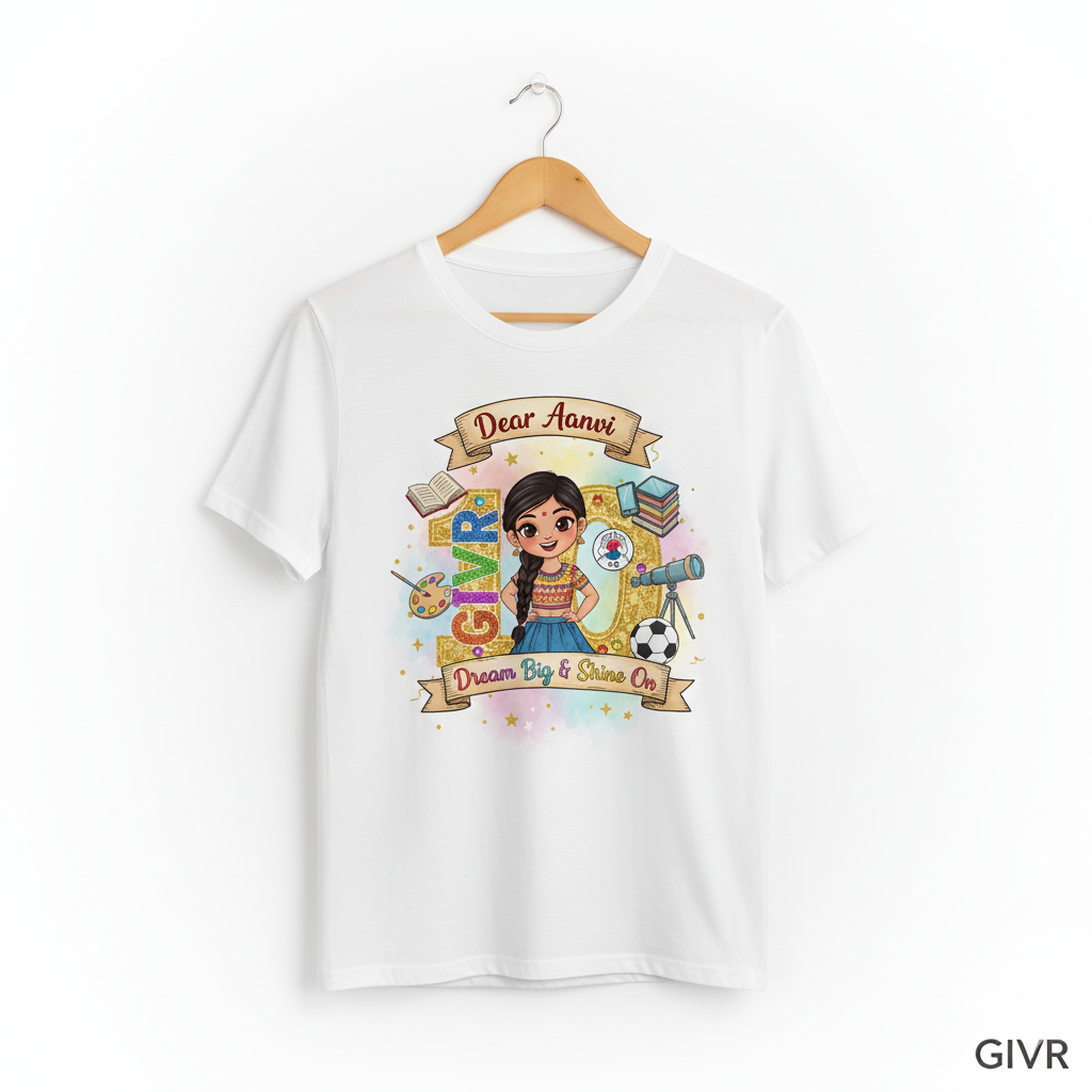 Brighten up your little girl’s wardrobe with our charming and delightful “Sweet Playtime” White T-Shirt, exclusively featuring the adorable Indian girl with her doll and soft toys design! This unique tee captures a moment of joyful innocence, making it a perfect addition to any young girl’s collection. Crafted from soft, breathable 100% cotton fabric, this half-sleeve, round-neck T-shirt ensures all-day comfort while keeping your child cool and confident. The vibrant, high-quality sublimation print showcases a cute Indian girl, around 7-8 years old, playing happily with her favorite doll, a gentle elephant, and a cuddly tiger, all surrounded by a shower of colorful confetti in a cozy room. The GIVR brand signature is subtly integrated within the artwork, assuring authenticity and quality. The regular fit allows for easy movement, making it ideal for playtime, school, outings, casual wear, or comfortable lounging at home. The fabric is gentle on delicate skin, colorfast, and designed to maintain its charm and durability even after multiple washes. Perfectly suited for girls aged 7 to 12 years, this T-shirt blends heartwarming style with practicality. Whether it’s for everyday fashion, a thoughtful birthday gift, or simply adding a touch of cheer to her wardrobe, this T-shirt offers a unique design and vibrant imagery that will quickly become a cherished favorite. ***Please mention which design you will prefer or randomly any design may be shipped” Key Features: Charming Design: Features a sweet Indian girl playing with her doll and plush toys. Premium Comfort: Made from 100% soft, breathable cotton for all-day wear. Vibrant & Durable Print: High-quality sublimation ensures lasting colors and detail. Everyday Versatility: Ideal for school, playdates, or relaxing at home. Authentic GIVR Brand: Signature integrated subtly into the design. Give your child the joy of a unique design and everyday comfort with this must-have T-shirt! Perfect gift for kids birthday return gift or any other kind of return gift
